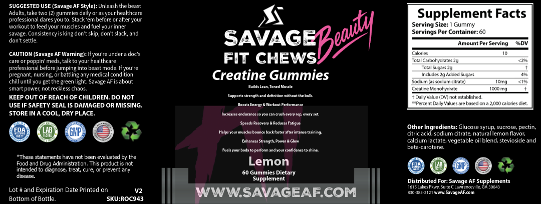 Meet Fit Chews, the delicious creatine gummy made for women who want strength, curves, energy, and confidence — without dealing with powders, scoops, or mixers. Each chew delivers 1,000mg of pure creatine to help you lift heavier, tone faster, and recover like a Savage Beauty.